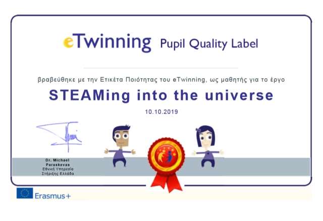 Συγκεκριμένα βραβεύθηκαν τέσσερα έργα e-Twinning τού Σχολείου: “The little music STEAMers” (A΄ τάξη), “A walk through cultural heritage – cities that grew out of a castle/palace” (Δ΄ τάξη), “It’s not rocket science” (Ε΄ τάξη) και “STEAMing into the Universe” (Στ΄ τάξη).