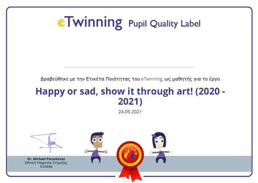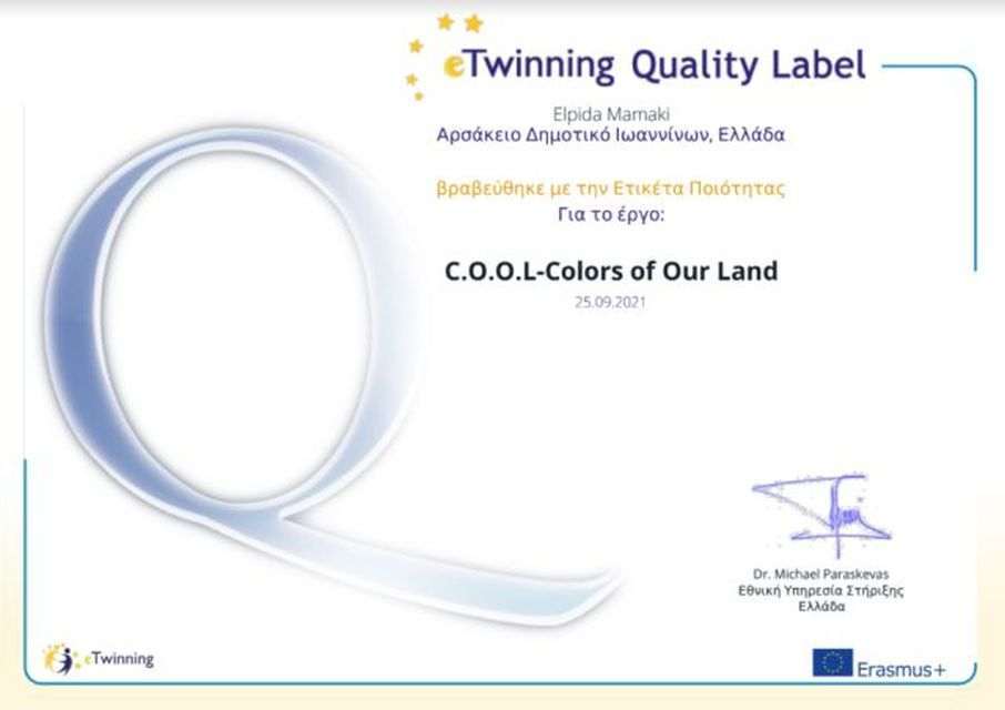 Οι μαθητές και οι εκπαιδευτικοί τού Αρσακείου Δημοτικού Ιωαννίνων βραβεύθηκαν με την Εθνική Ετικέτα Ποιότητας για το υψηλό επίπεδο των e-Twinning έργων «Happy or sad, show it through art!» (Β΄ τάξη), «Healthy Food: good for you, good for the planet» (Β΄ και Γ΄ τάξη) και «C.O.O.L. – Colours of Our Land» (Δ΄ τάξη).