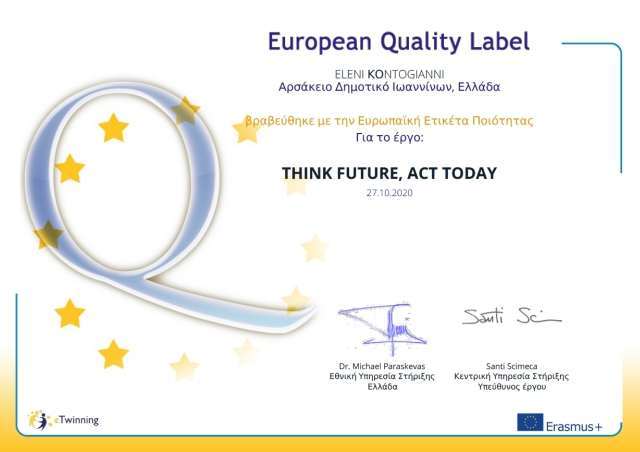 Οι εκπαιδευτικοί και οι μαθητές τής Δ΄ τάξης τού Αρσακείου Δημοτικού Ιωαννίνων βραβεύτηκαν με την Ευρωπαϊκή Ετικέτα Ποιότητας για την αρτιότητα τής εργασίας τους στο έργο e-Twinning «THINK FUTURE, ACT TODAY», το οποίο υλοποιήθηκε κατά το σχολικό έτος 2019-2020.
