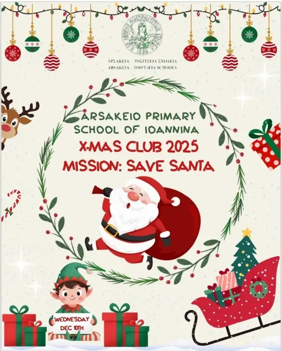 Την Τετάρτη 10 Δεκεμβρίου 2025 πραγματοποιήθηκε με ιδιαίτερη επιτυχία στο Αρσάκειο Δημοτικό Ιωαννίνων το Arsakeio Christmas Club in English, με φετινό τίτλο «Mission: Save Santa!». Πρόκειται για μια καθιερωμένη χριστουγεννιάτικη εκπαιδευτική δράση τού Σχολείου, η οποία οργανώνεται και συντονίζεται κάθε χρόνο από το Τμήμα Αγγλικής Γλώσσας και εντάσσεται στο πλαίσιο τής βιωματικής μάθησης και τής διαθεματικής προσέγγισης CLIL (Content and Language Integrated Learning).