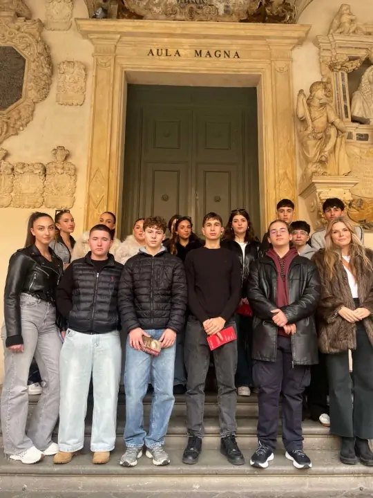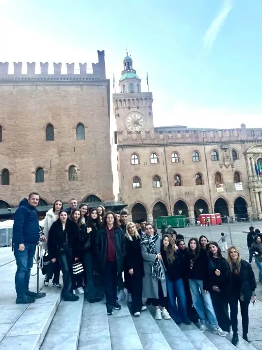 Τη δεύτερη ημέρα οι μαθητές επισκέφθηκαν την Μπολόνια και το ιστορικό Πανεπιστήμιο της πόλης, το οποίο διεκδικεί τον τίτλο του αρχαιότερου στον δυτικό κόσμο. Την ομάδα μαθητών και καθηγητών του Αρσακείου Γενικού Λυκείου υποδέχτηκε στις πύλες του Πανεπιστημίου η Καθηγήτρια του Τμήματος Κλασικής Φιλολογίας και Ιταλικών Σπουδών, κυρία Chiara Gianollo. Η κυρία Gianollo αφού παρουσίασε ιστορικά στοιχεία σχετικά με την ίδρυση και τη μακραίωνη ιστορία του Πανεπιστημίου, ξενάγησε την ομάδα στους χώρους του, εστιάζοντας ιδιαίτερα σε αγάλματα και στήλες που μνημονεύουν σημαντικές προσωπικότητες που δίδαξαν ή μαθήτευσαν ανά τους αιώνες στο Ίδρυμα. Στη συνέχεια, μαθητές και εκπαιδευτικοί είχαν την τιμή να γίνουν δεκτοί στους χώρους του Τμήματος από την Τακτική Καθηγήτρια Κλασικής Φιλολογίας και Ιταλικών Σπουδών, κυρία Valentina Garulli και απο τον Αναπληρωτή Καθηγητή Ελληνικής Γλώσσας και Λογοτεχνίας, κύριο Marco Ercoles. Η κυρία Garulli και ο κύριος Ercoles, αλλά και μεταπτυχιακές φοιτήτριες του Τμήματος περιέγραψαν τον τρόπο με τον οποίο διδάσκονται τα Αρχαία Ελληνικά και τα Λατινικά, δίνοντας έμφαση στις καινοτόμες μεθόδους που αξιοποιούνται στο Πανεπιστήμιο, αλλά και στην προσπάθεια που καταβάλλεται, μέσω δράσεων και προγραμμάτων, να γίνουν τα αρχαία ελληνικά κείμενα και τα διαχρονικά μηνύματα που αυτά μεταφέρουν κτήμα όλο και περισσότερων ανθρώπων και ιδιαίτερα όσων δεν έχουν προηγούμενη επαφή με τις κλασικές σπουδές. Στο πλαίσιο της στενής συνεργασίας του Τμήματος με Λύκεια της Ιταλίας, συζητήθηκε και η πιθανότητα μελλοντικής συνεργασίας με το Αρσάκειο Γενικό Λύκειο Ιωαννίνων σε κάποια δράση, η οποία ήδη υλοποιείται από Πανεπιστήμιο της Μπολόνια. Η επίσκεψη αυτή προσέφερε στους μαθητές μια μοναδική ευκαιρία, ώστε να κατανοήσουν τη λειτουργία ενός κορυφαίου ακαδημαϊκού ιδρύματος, αλλά και να αντιληφθούν τη σημασία και ίσως την αναγκαιότητα μελέτης των κλασικών κειμένων.