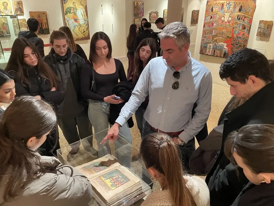 Πρώτος σταθμός η Βενετία και το Ελληνικό Ινστιτούτο Βυζαντινών και Μεταβυζαντινών Σπουδών, το οποίο επισκέφθηκε το Σχολείο κατόπιν πρόσκλησης. Κατά την επίσκεψη, οι εκπαιδευτικοί είχαν την τιμή να συναντηθούν με τον Πρόεδρο του Ινστιτούτου, Καθηγητή της Θεολογικής Σχολής του Α.Π.Θ, κ. Βασίλειο Κουκουσά, και να ξεναγηθούν από τον ίδιο στο κτήριο του παλαιού Κολλεγίου Φλαγγίνη. Ο κ. Κουκουσάς παρουσίασε σημαντικά στοιχεία για τη δράση του Ινστιτούτου, επισημαίνοντας τη σημασία της ψηφιοποίησης των αναρίθμητων, ανεκτίμητης αξίας χειρογράφων που ανήκουν στο αρχείο του Ινστιτούτου. Στη συνέχεια, οι μαθητές είχαν τη μοναδική ευκαιρία να παρακολουθήσουν ένα βιωματικό μάθημα βυζαντινής ιστορίας στο Μουσείο των Εικόνων, το οποίο φιλοξενεί μια από τις σημαντικότερες συλλογές έργων ορθόδοξης τέχνης. Στη μουσειακή συλλογή περιλαμβάνονται αριστουργήματα της βυζαντινής αγιογραφίας όπως οι εικόνες που έφερε από την Κωνσταντινούπολη, τον 15ο αιώνα, η Άννα Παλαιολογίνα Νοταρά, δεκάδες έργα ανώνυμων αλλά και επώνυμων ζωγράφων, αλλά και πολύτιμα χειρόγραφα μεταξύ των οποίων ένα περγαμηνό ευαγγελιστάριο του 13ου αιώνα, το Μυθιστόρημα του Μεγάλου Αλεξάνδρου. Για τη λειτουργία του Μουσείου Εικόνων και για τα πολύτιμα εκθέματά του μαθητές και εκπαιδευτικοί ενημερώθηκαν από τη Διευθύντρια Μουσείου, κυρία Ειρήνη Κατσιούρη, η οποία τόνισε τη συμβολή του Ιδρύματος ως προς τη διατήρηση του ελληνικού πολιτισμού και της ελληνορθόδοξης παράδοσης στη δυτική Ευρώπη. Τέλος, οι μαθητές ξεναγήθηκαν στον ναό του Αγίου Γεωργίου των Ελλήνων, στην παλαιότερη ελληνορθόδοξη εκκλησία της Δύσης και θαύμασαν την ιδιαίτερη αρχιτεκτονική του.