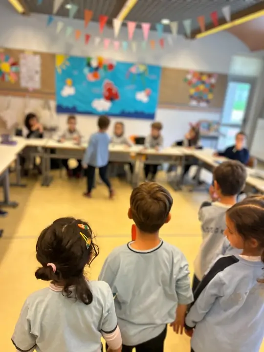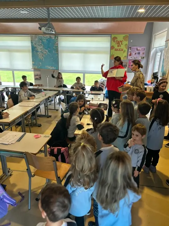 Στη συνέχεια, οι μικροί μας μαθητές και μαθήτριες επισκέφθηκαν τις τάξεις του Δημοτικού, κρατώντας μικρές κάρτες–«δικαιώματα», τις οποίες μοίρασαν στα μεγαλύτερα παιδιά. Η συμβολική αυτή δράση υπενθύμισε σε όλους ότι: « Όλοι, μικροί και μεγάλοι, έχουμε ευθύνη να προστατεύουμε και να υπερασπιζόμαστε τα δικαιώματα των παιδιών.