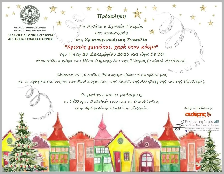 Τα Αρσάκεια Σχολεία Πατρών σας προσκαλούν στη Χριστουγεννιάτικη Συναυλία την Τρίτη 23 Δεκεμβρίου 2025 και ώρα 18:30 στον αύλειο χώρο του Νέου Δημαρχείου Πατρών (Παλαιό Αρσάκειο).