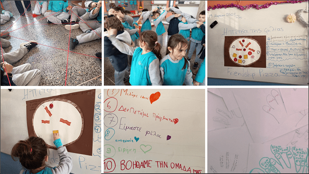 Κατά την πρώτη συνάντηση οι μαθητές μέσω βιωματικών ασκήσεων, καθόρισαν το “συμβόλαιο”, στο οποίο περιέλαβαν τις συμπεριφορές που βοηθούν τη λειτουργία τής ομάδας. Κατά τη δεύτερη συνάντηση έφτιαξαν την «πίτσα τής φιλίας», στην οποία κάθε υλικό αντιστοιχούσε σε ένα συστατικό τής φιλίας, και συζητήθηκαν οι σκέψεις των μαθητών πάνω σε αυτά. Στην τρίτη συνάντηση αναδείχθηκε και συζητήθηκε η αξία τής ευγένειας, μέσω τής καταγραφής μιας ευγενικής φράσης για έναν συμμαθητή τους.