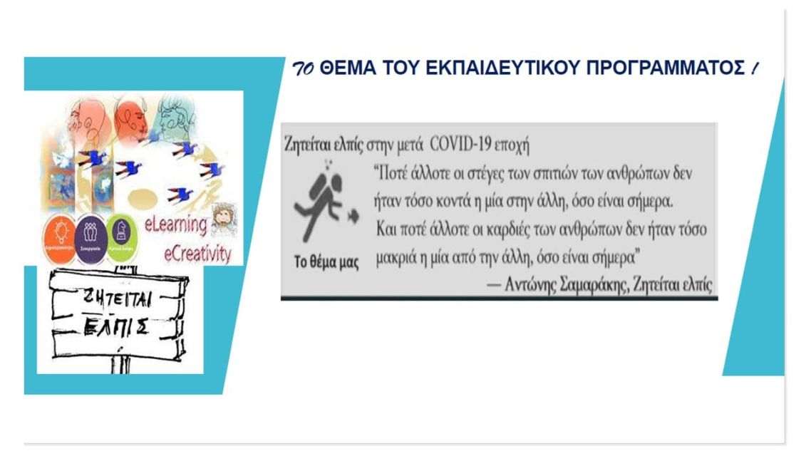 Χαιρετισμό στην εκδήλωση απηύθυνε και ο Δήμαρχος Πατρέων κ. Κωνσταντίνος Πελετίδης, ο οποίος επιβράβευσε μαθητές και εκπαιδευτικούς για τη συμμετοχή τους στο πρόγραμμα και τη δημιουργικότητά τους, τονίζοντας πως τα παιδιά είναι η ελπίδα τής κοινωνίας μας.