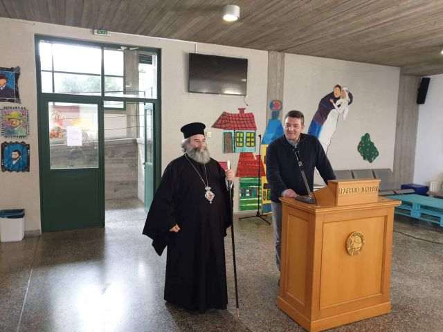 Ο Σεβασμιότατος, που είναι και Εταίρος τής Φιλεκπαιδευτικής Εταιρείας, με την ευκαιρία τού εορτασμού των τριών Ιεραρχών μίλησε στους μαθητές τού Γυμνασίου και τού Λυκείου, στον πολυχώρο των Σχολείων.