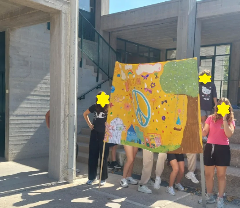 Ομάδα μαθητών τού Αρσακείου Γυμνασίου Πατρών, με την καθοδήγηση τής κ. Κ. Στασινοπούλου, καθηγήτριας Εικαστικών, MSc-MEd, την Παρασκευή 30 Σεπτεμβρίου 2025, δημιούργησε ένα πανό ζωγραφικής που απεικονίζει τη δύναμη τής συνεργασίας, την αλληλεγγύη μεταξύ των λαών και την ελπίδα για έναν κόσμο χωρίς πολέμους…