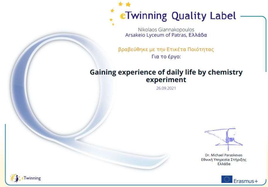 Ομάδα μαθητών τού Αρσακείου Λυκείου Πατρών, υπό την επίβλεψη τού κ. Νικόλαου Γιαννακόπουλου (χημικού), απέσπασε Ετικέτα Ποιότητας e-Twinning για το πρόγραμμα: «Gaining experience of daily life by chemistry experiment».