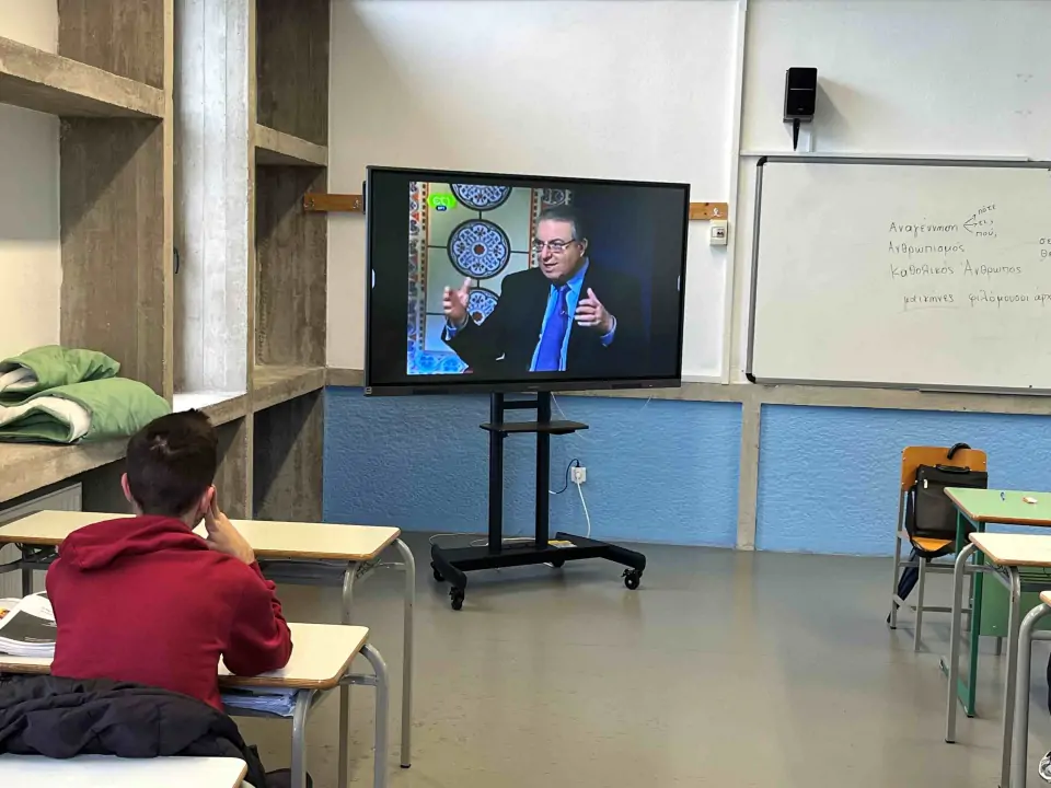 Μετά την παρουσίαση, προβλήθηκε στους διαδραστικούς πίνακες των τάξεων η εκπομπή «ΑΡΧΟΝΤΑΡΙΚΙ» της ΕΡΤ1 με παρουσιαστή τον Σεβασμιώτατο Μητροπολίτη Δημητριάδος κ. Ιγνάτιο και θέμα: «Εκκλησία και παιδεία» με καλεσμένο τον Πρόεδρο των Αρσακείων Σχολείων, Καθηγητή Γλωσσολογίας και τ. Πρύτανη του Πανεπιστημίου Αθηνών κ. Γεώργιο Μπαμπινιώτη.