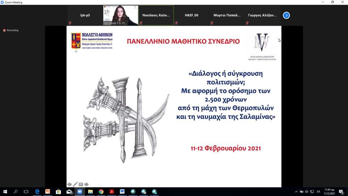 Με μεγάλη επιτυχία συνεχίζονται οι εργασίες τού πανελλήνιου μαθητικού διαδικτυακού συνεδρίου Ιστορίας που διοργανώνεται από το Κολλέγιο Αθηνών το διήμερο 11-12 Φεβρουαρίου 2021 με θέμα «Διάλογος ή σύγκρουση πολιτισμών; Με αφορμή το ορόσημο των 2.500 χρόνων από τη μάχη των Θερμοπυλών και τη ναυμαχία τής Σαλαμίνας».