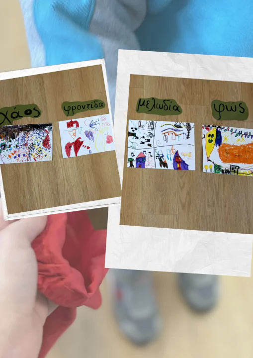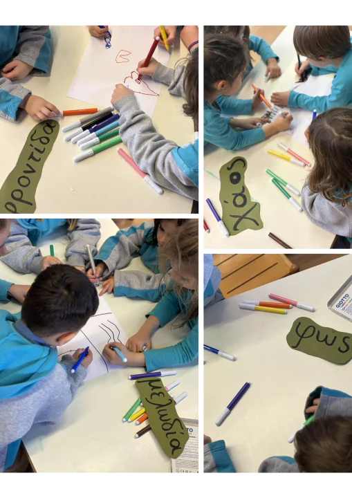 Στη συνέχεια, συζητήσαμε για το πώς οι λέξεις κρύβουν έννοιες, εικόνες και νοήματα. Αναλύσαμε επιλεγμένες λέξεις και τα παιδιά κλήθηκαν να φανταστούν και να ζωγραφίσουν πώς θα μπορούσε να μοιάζει μια χώρα που θα είχε το όνομα και το νόημα κάθε λέξης. Οι δημιουργίες των μαθητών ήταν πραγματικά αξιοθαύμαστες, γεμάτες φαντασία, χρώμα και πρωτοτυπία.