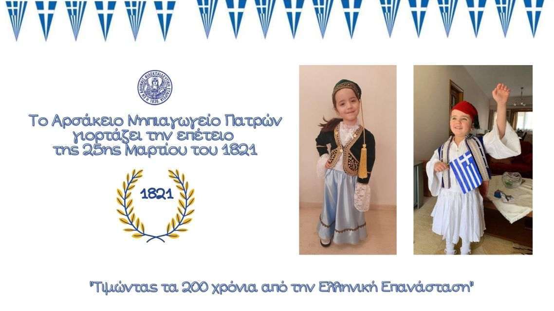 Οι μικροί μαθητές τού Αρσακείου Νηπιαγωγείου Πατρών την Τετάρτη 24 Μαρτίου 2021 γιόρτασαν τα 200 χρόνια από την ελληνική Επανάσταση.