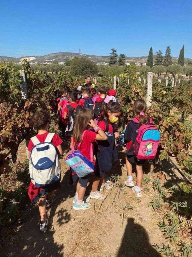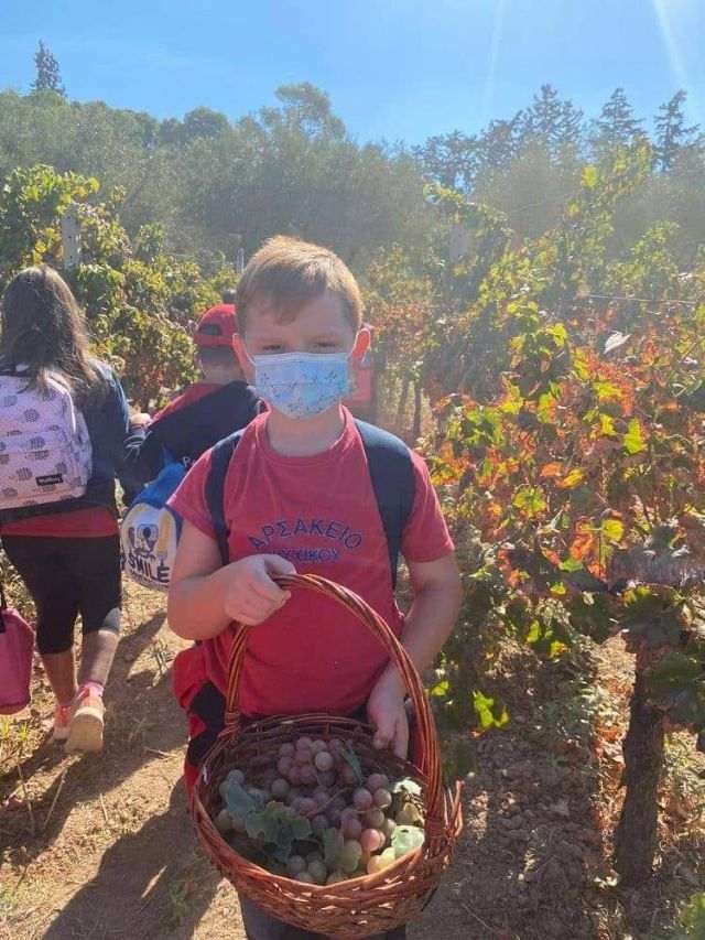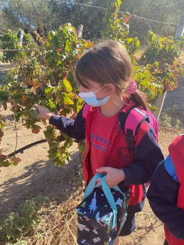 Οι μαθητές ξεναγήθηκαν στον βιολογικό αμπελώνα και συμμετείχαν στην αναπαράσταση τής συλλογής σταφυλιών από το αμπέλι.
