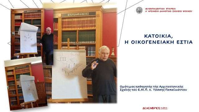 Την Παρασκευή 16 Δεκεμβρίου 2022, o ομότιμος καθηγητής τής Αρχιτεκτονικής Σχολής τού Ε.Μ.Π. κ. Τάσσης Παπαϊωάννου μίλησε στους μαθητές τής Στ΄ τάξης τού Α΄ Αρσακείου Δημοτικού Σχολείου Ψυχικού με θέμα “Κατοικία, η οικογενειακή εστία”, στον χώρο τής Βιβλιοθήκης των Σχολείων.