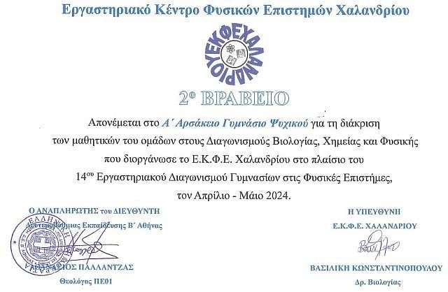 Το Α΄ Αρσάκειο Γυμνάσιο Ψυχικού, τον Απρίλιο και τον Μάιο τού 2024, εκπροσωπήθηκε από τρεις τριμελείς μαθητικές ομάδες στον 14ο Εργαστηριακό Διαγωνισμό Φυσικών Επιστημών που διοργανώνει το Ε.Κ.Φ.Ε. (Εργαστηριακό Κέντρο Φυσικών Επιστημών) Χαλανδρίου, με υπεύθυνη την κ. Βασιλική Κωνσταντινοπούλου, βιολόγο PhD.