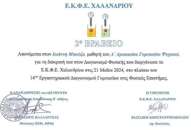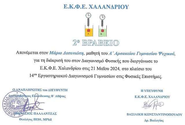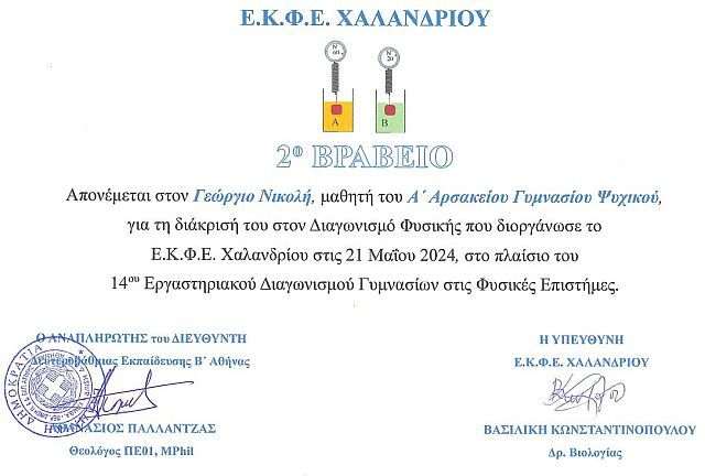 Το Α΄ Αρσάκειο Γυμνάσιο Ψυχικού, στις 23 Απριλίου 2024, εκπροσωπήθηκε από τούς μαθητές Μάριο Δεσυνιώτη (τμήμα Γ΄γ), Ιωάννη Μπούζα και Γιώργο Νικολή (τμήμα Γ΄γ) στον 14ο Εργαστηριακό Διαγωνισμό Φυσικών Επιστημών που διοργανώνει το Ε.Κ.Φ.Ε. (Εργαστηριακό Κέντρο Φυσικών Επιστημών) Χαλανδρίου, με υπεύθυνη την κ. Βασιλική Κωνσταντινοπούλου, βιολόγο PhD. Τα παιδιά κατέκτησαν το 2ο βραβείο στον διαγωνισμό. Η απονομή των βραβείων πραγματοποιήθηκε στις 28 Μαΐου 2024, στο ΕΚΦΕ Χαλανδρίου.