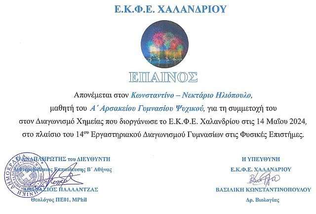 Το Α΄ Αρσάκειο Γυμνάσιο Ψυχικού, στις 23 Απριλίου 2024, εκπροσωπήθηκε από τούς μαθητές Αικατερίνη Βασιλείου (τμήμα Γ΄α), Κωστή Ηλιόπουλο (τμήμα Γ΄α) και Γιώργο Νικολή (τμήμα Γ΄γ) στον 14ο Εργαστηριακό Διαγωνισμό Φυσικών Επιστημών που διοργανώνει το Ε.Κ.Φ.Ε. (Εργαστηριακό Κέντρο Φυσικών Επιστημών) Χαλανδρίου, με υπεύθυνη την κ. Βασιλική Κωνσταντινοπούλου, βιολόγο PhD.