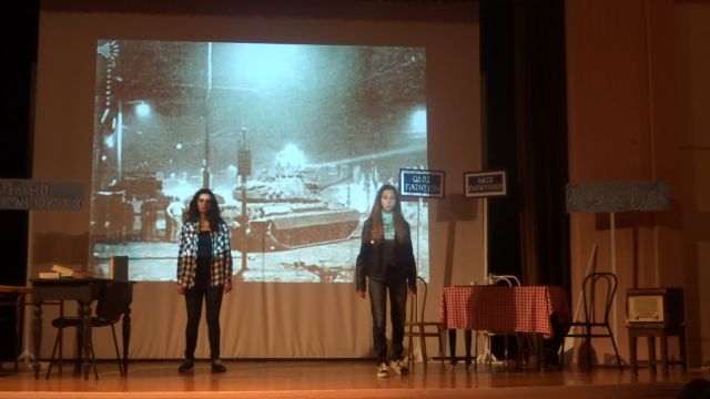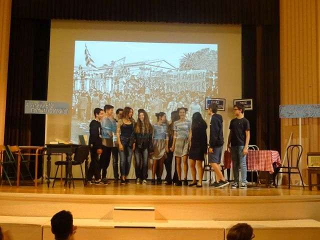 Οι μαθητές τού Α΄ Αρσακείου Γυμνασίου παρουσίασαν ένα θεατρικό δρώμενο σε τρεις πράξεις (Καφενείον η Ελλάς, Εδώ Πολυτεχνείο, Το Πολυτεχνείο σήμερα-συζήτηση σε μια σχολική τάξη) προσπαθώντας να αποτυπώσουν το κλίμα τής εποχής και να προβάλουν τη σημασία των δημοκρατικών αξιών στο σήμερα. Στο θεατρικό συμμετείχαν οι μαθητές: Αλαφάκη Ζωή, Αλβέρτου-Χάμμαντ Αναστασία, Αναστασόπουλος Αντώνιος, Βολτή Αλκυόνη, Βούλγαρης Νικόλαος, Γαλούκα Κατερίνα, Γιαμπάνη Μαρία-Νεφέλη, Γιαλούρη Πηνελόπη, Διάρου Μάρθα, Ευαγγελίδη Ματίνα, Παλιούρας Κωνσταντίνος, Τζανής Κωνσταντίνος, Τσίλη Μαρία και Χάρδας Γιάννης.