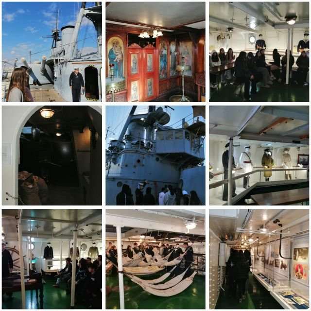 Οι μαθητές ξεναγήθηκαν, σε τρεις ομάδες, στους χώρους του πλοίου και έμαθαν για την ιστορία του. Το πλοίο, το οποίο είναι ατμόπλοιο και ως καύσιμο χρησιμοποιούσε κάρβουνο, υπήρξε η ναυαρχίδα τού Ελληνικού στόλου κατά την διάρκεια και των δύο Παγκοσμίων Πολέμων, παροπλίστηκε το 1952 και μετατράπηκε σε Μουσείο 30 χρόνια περίπου αργότερα, το 1984. Πλέον είναι αγκυροβολημένο στη Μαρίνα τού Φλοίσβου και ανοικτό στο κοινό προς επίσκεψη, καθώς αποτελεί ένα σημαντικό μνημείο τής σύγχρονης Ιστορίας τής Ελλάδας.