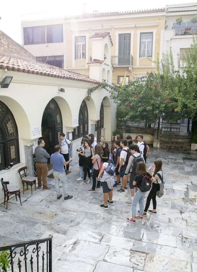 Ακολουθώντας μια κυκλική διαδρομή, με αφετηρία την πλατεία Μητροπόλεως, οι μαθητές διέσχισαν την οδό Αδριανού στην Πλάκα, είδαν το ΑρχιεσκοπικόΜέγαρο, το πιο παλιό αρχοντικό τής Αθήνας, το «Αρχοντικό των Μπενιζέλων», τη Ρωμαϊκή Αγορά με το ωρολόγιο τού Κυρρήστου (Αέρηδες) και το Φετιχέ Τζαμί.