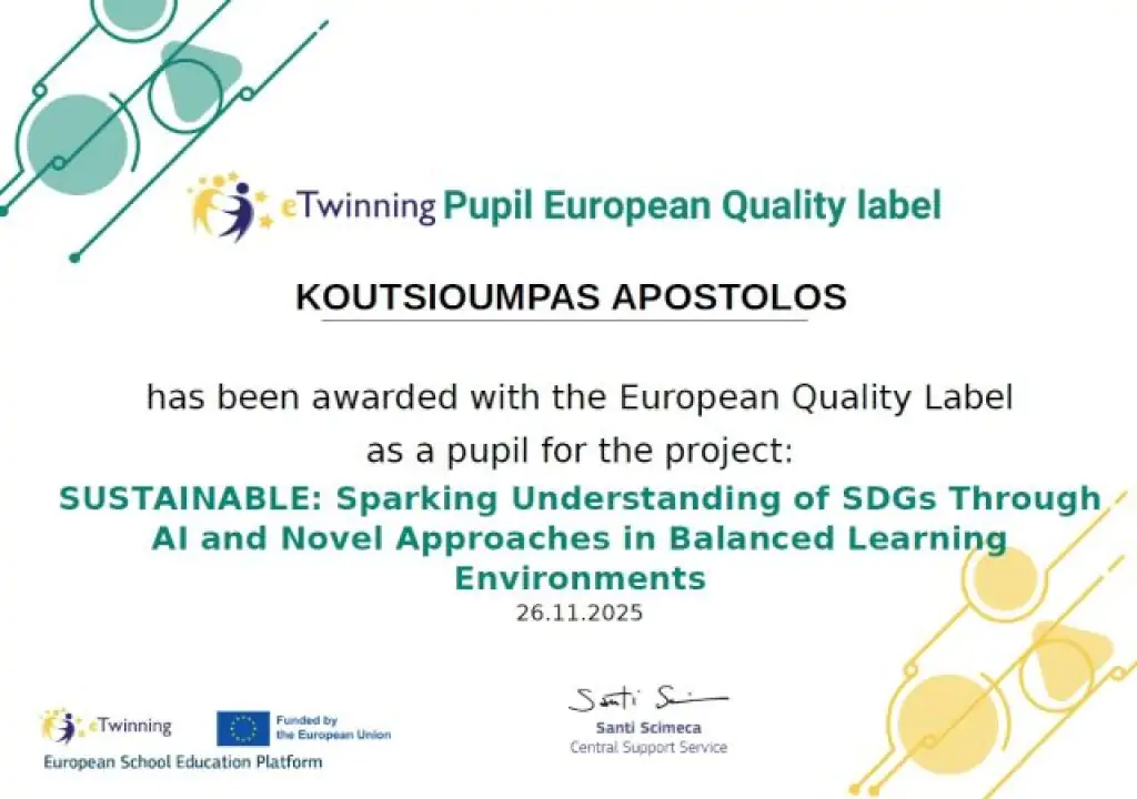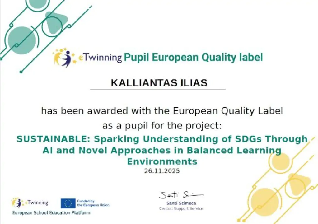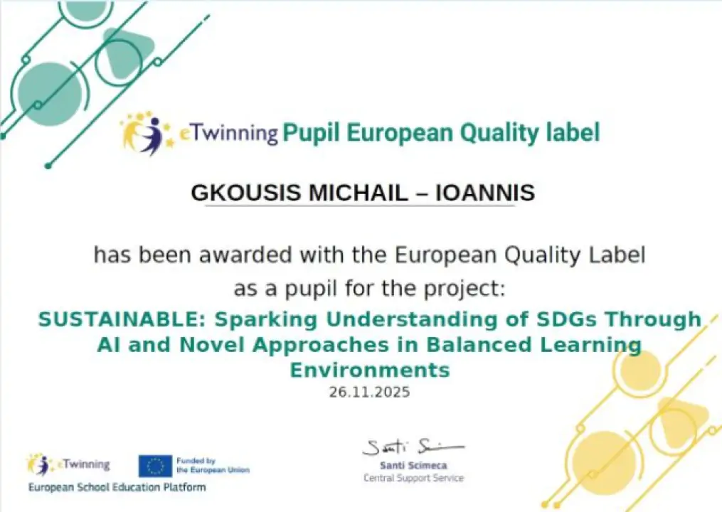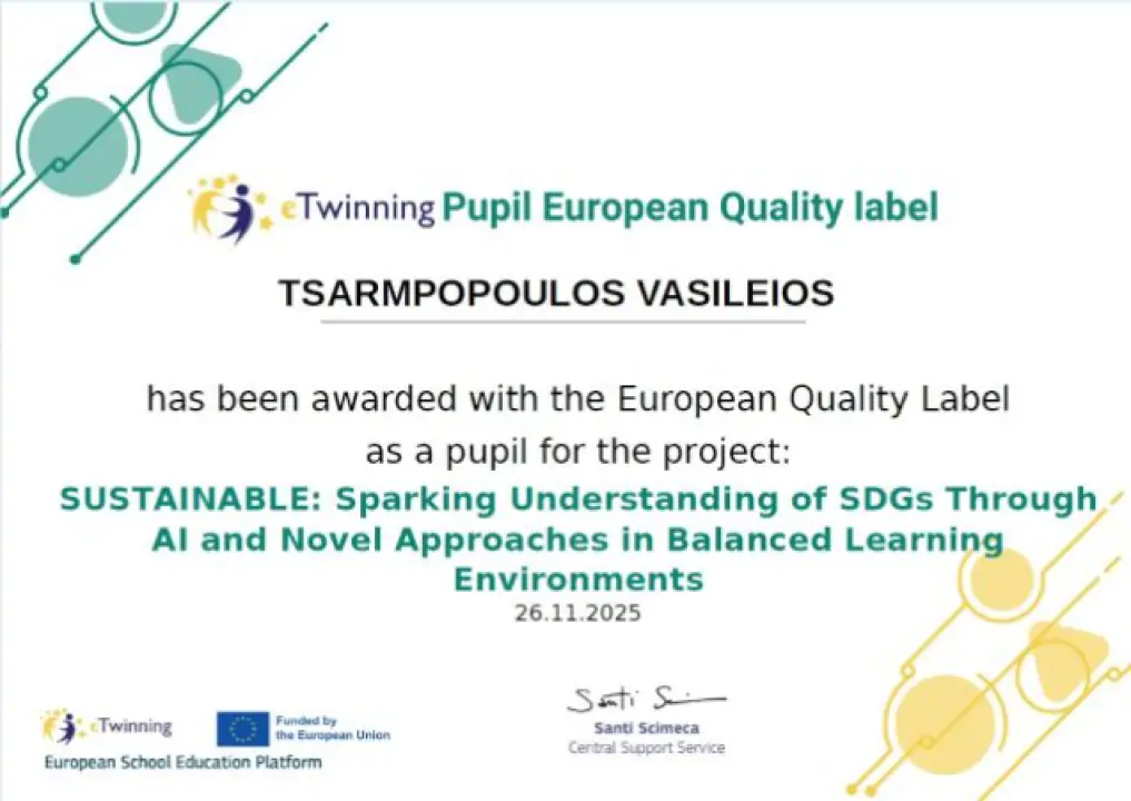 Το Α΄ Αρσάκειο Γυμνάσιο Ψυχικού βραβεύτηκε με την Ευρωπαϊκή Ετικέτα Ποιότητας από την Κεντρική Ευρωπαϊκή Υπηρεσία Υποστήριξης eTwinning για τη συμμετοχή ομάδας μαθητών και μαθητριών στο ευρωπαϊκό eTwinning έργο «SUSTAINABLE: Sparking Understanding of SDGs Through AI and Novel Approaches in Balanced Learning Environments».