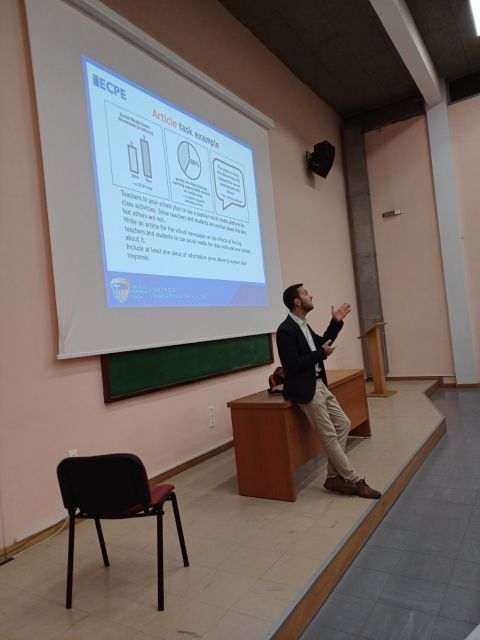 Το θέμα ήταν οι εξετάσεις γλωσσομάθειας τού Πανεπιστημίου τού Michigan για το επίπεδο C2 (Proficiency). Οι μαθητές είχαν την ευκαιρία να ενημερωθούν για πρακτικά θέματα αλλά και βασικές λεπτομέρειες, να εξοικειωθούν με τη διαδικασία και τις απαιτήσεις τόσο των γραπτών όσο και των προφορικών τμημάτων τής εξέτασης, αλλά και να εκφράσουν και να επιλύσουν απορίες τους για την καλύτερη δυνατή προετοιμασία τους.