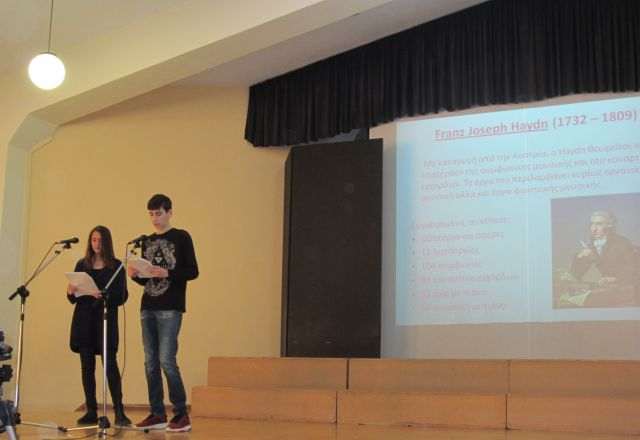 Οι μαθητές της Γ΄ τάξης Παύλος Νανούσης και Σοφία Παπαοικονόμου παρουσίασαν στους μαθητές του Γυμνασίου τα βασικά χαρακτηριστικά του αισθητικού και καλλιτεχνικού κινήματος του κλασικισμού, το οποίο εκφράστηκε μέσα από όλες τις τέχνες (τη μουσική, τη ζωγραφική, την αρχιτεκτονική, τη λογοτεχνία και το θέατρο) και εμπνεύστηκε από τις αξίες και τα ιδανικά του Διαφωτισμού. Στη συνέχεια, ανέδειξαν τα μουσικά χαρακτηριστικά του, κάνοντας αναφορά στη ζωή και το έργο μουσικών εκπροσώπων του. Το αφιέρωμα (δείτε την παρουσίαση) περιλάμβανε σχετικές προβολές και μουσική εκτέλεση πιανιστικών έργων από μαθητές.