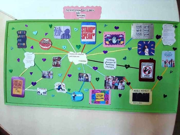 Στη συνέχεια, φιλοτέχνησαν ταμπλό με το πλούσιο αυτό υλικό. Επίσης, η μαθήτρια Μάιρα Σπανού της Α΄ τάξης, που βραβεύτηκε στους Α.ΛΟ.ΤΕ με το Α΄ Βραβείο Ποίησης, ανήρτησε στο ίδιο ταμπλό δύο στροφές του βραβευθέντος ποιήματός της οι οποίες «συνομιλούν» τόσο με τον θύτη όσο και το θύμα του bullying.