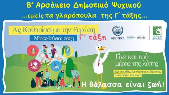 Οι μαθητές και οι μαθήτριες τής Γ΄ τάξης τού Β΄ Αρσακείου Δημοτικού Σχολείου Ψυχικού τα μικρά “γλαρόπουλα” τής Ελληνικής Ένωσης Προστασίας Θαλασσίου Περιβάλλοντος“Helmepa”, την Πέμπτη 8 Ιουνίου 2023, ανέλαβαν εθελοντική δράση και καθάρισαν την ακτήΜεγάλο Καβούρι από πλαστικά και ανακυκλώσιμα απορρίμματα.