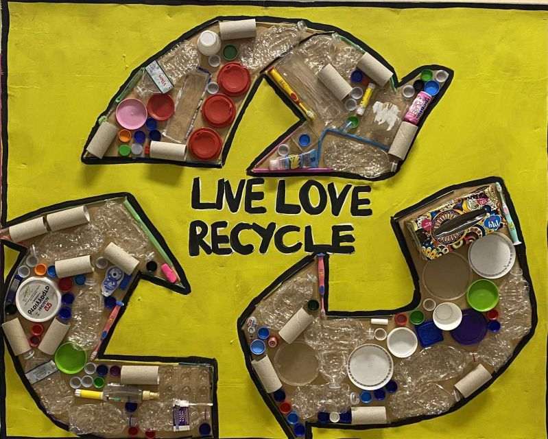 Τέλος, στο εργαστήρι τής Αισθητικής Αγωγής, με τα πλαστικά που χρησιμοποιούν συχνά, έφτιαξαν ένα έργο με το σύνθημα: “Live Love Recycle”, το οποίο και τοποθέτησαν στο χολ τού Σχολείου, ώστε να κινητοποιήσουν και τους συμμαθητές τους με στόχο να αποφεύγουν στην καθημερινότητά τους τη χρήση πλαστικών..
