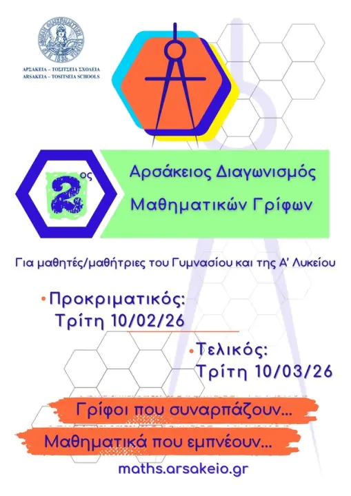 Την Τετάρτη, 11 Φεβρουαρίου 2026, ανακοινώθηκαν τα ονόματα των διακριθέντων της προκριματικής φάσης του 2ου Αρσάκειου Διαγωνισμού Μαθηματικών Γρίφων. Στην τελική φάση του Διαγωνισμού, που θα διεξαχθεί στις 10 Μαρτίου 2026, προκρίθηκαν οι παρακάτω μαθητές και μαθήτριες του Β΄Αρσακείου Γυμνασίου Ψυχικού :