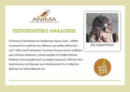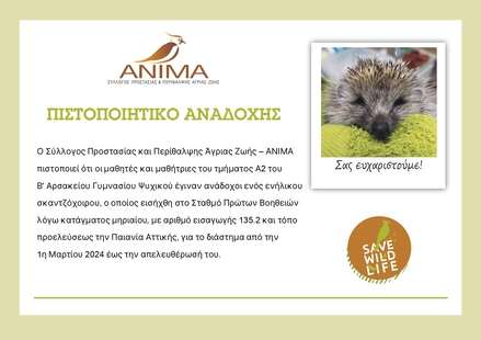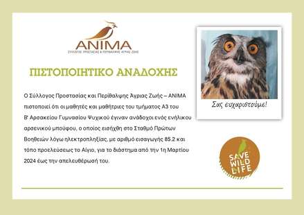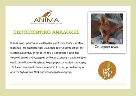 Μετά από συγκέντρωση χρημάτων από τους μαθητές μας και τον Σύλλογο των Καθηγητών υιοθετήσαμε, επισήμως, τα πληγωμένα αυτά ζωάκια που περιθάλπονται στον Σταθμό Πρώτων Βοηθειών τής “AΝΙΜΑ”, τού Συλλόγου Προστασίας και Περίθαλψης Άγριας Ζωής, από την 1η Μαρτίου μέχρι την απελευθέρωσή τους. Είχε προηγηθεί ενημέρωση των μαθητών μας στο Σχολείο με απώτερο στόχο την ευαισθητοποίησή τους σε ό,τι αφορά τα ζώα και το περιβάλλον.