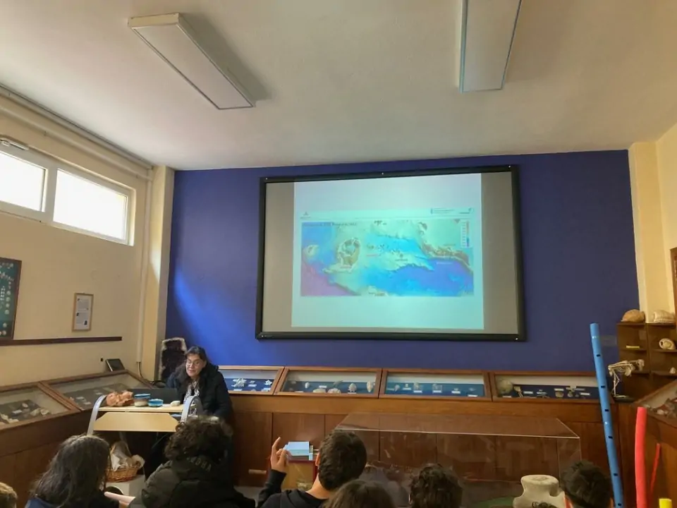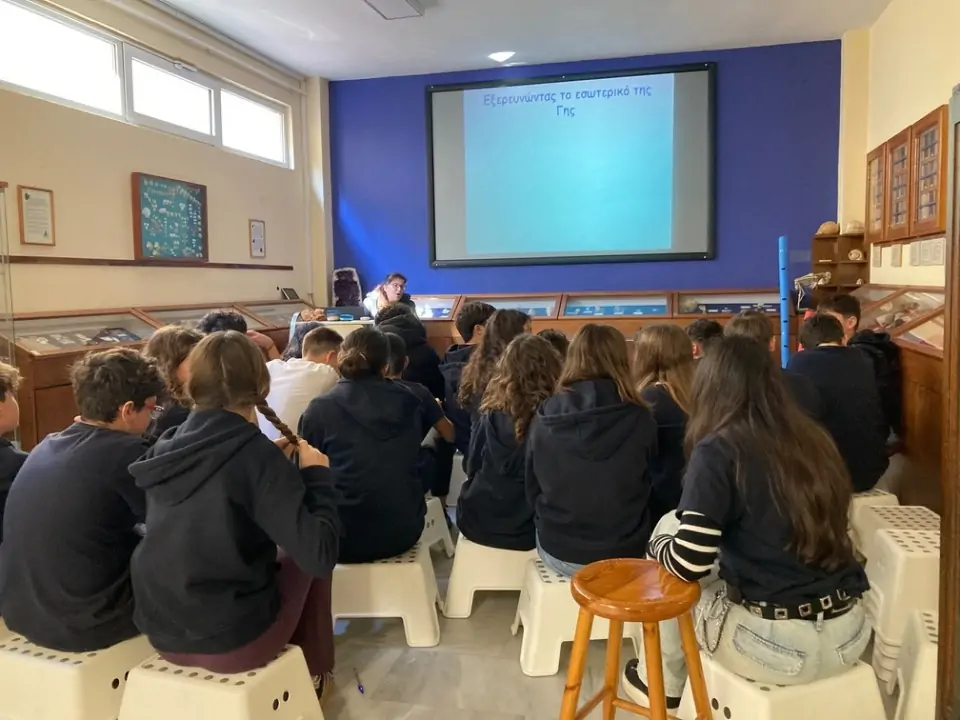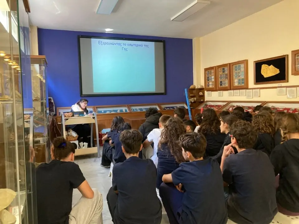 Κατά την επίσκεψή τους η κ. Φανή Τριπολιτσιώτου, Γεωλόγο και Υπεύθυνη του Μουσείου Φυσικής Ιστορίας παρουσίασε το θέμα «Κινήσεις λιθοσφαιρικών πλακών: Σεισμοί, ηφαίστεια, ορογενέσεις – Το παράδειγμα της Σαντορίνης».