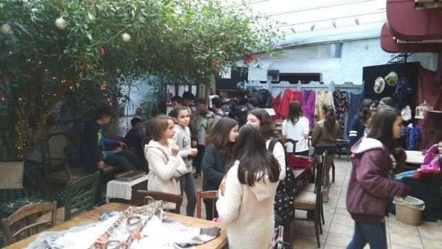 Τους υποδέχθηκαν άνθρωποι τού θεάτρου με κεράσματα και ξεναγήθηκαν στο αίθριό του, που ήταν γεμάτο προθήκες με κοστούμια ηθοποιών από παλαιότερες παραστάσεις.