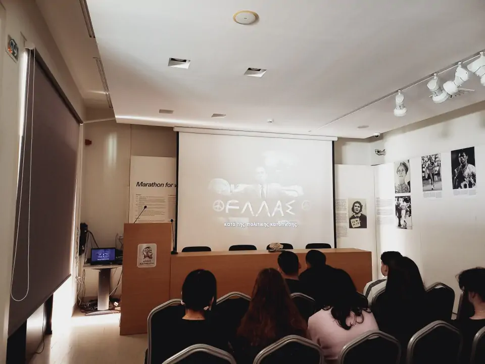 Στη συνέχεια παρακολουθήσαμε στην αίθουσα συνεδριάσεων του μουσείου ένα πολύ ενδιαφέρον και καλογυρισμένο ντοκιμαντέρ για τη μάχη του Μαραθώνα και την ιστορία του Μαραθωνίου Δρόμου.
