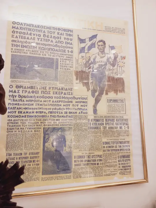 Σε άλλο σημείο του μουσείου είδαμε ολυμπιακές δάδες από το 1936 (Ολυμπιακοί Βερολίνου, όταν και ξεκίνησε η παράδοση της αφής και της λαμπαδηδρομίας) μέχρι σήμερα. Προσωπικά αντικείμενα (παπούτσια και αθλητικές εμφανίσεις) σπουδαίων μαραθωνοδρόμων ανδρών και γυναικών, Ελλήνων και ξένων. Πολύ συγκινητική επίσης η αναφορά της κας Σπανού στον Βαλκανιονίκη γιατρό Γρηγόρη Λαμπράκη που δολοφονήθηκε από το παρακράτος στην πορεία ειρήνης στη Θεσσαλονίκη κρατώντας το γνωστό πανό με τη λέξη «Ελλάδα» και τα σήματα της ειρήνης.