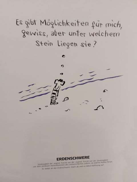 Αρχικά, περιηγήθηκαν στην έκθεση αφίσας “Komplett Kafka” που πραγματοποιείται στο Goethe-Institut σε συνεργασία με τον καλλιτέχνη Nicolas Mahler και το Literaturhaus Stuttgart (Λογοτεχνικό Σπίτι τής Στουτγκάρδης). Οι μαθητές άντλησαν τις απαραίτητες για την συμμετοχή τους στο εργαστήριο πληροφορίες σχετικά με τη ζωή και το έργο τού Κάφκα, ο οποίος, εκτός από τη συγγραφική του δραστηριότητα, είχε έντονη αγάπη και για το σχέδιο.