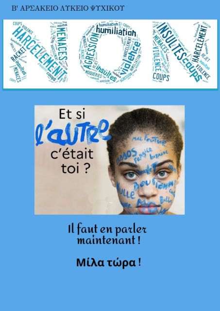 Οι γαλλόφωνοι μαθητές τής Α΄τάξης τού Β΄Αρσακείου Λυκείου Ψυχικού, από το τμήμα τής καθηγήτριας κ. Κατερίνας Τσιχλή, ευαισθητοποιημένοι στο θέμα τής βίας και του εκφοβισμού και συμμετέχοντας ενεργά στη δράση «Μίλα τώρα!», μια πρωτοβουλία τού Υπουργείου Παιδείας και τού «Χαμόγελου τού παιδιού», δημιούργησαν τη δική τους αφίσα-σύνθημα.
