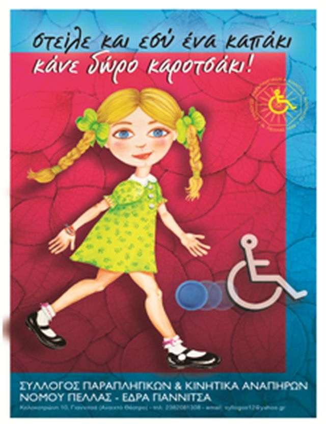 Ο Σύλλογος Παραπληγικών και κινητικά Ανάπηρων τού νομού Πέλλας, για 8η συνεχή χρονιά, υποστηρίζει με μεγάλη επιτυχία τη δράση «Συλλέγουμε πλαστικά καπάκια και προσφέρουμε αναπηρικά αμαξίδια» και συγκεντρώνει καπάκια από όλη την Ελλάδα απευθυνόμενος σε σχολεία, δημόσιους φορείς, οργανισμούς, συλλόγους, εκκλησίες, ιδρύματα, στρατιωτικές μονάδες, αστυνομικά τμήματα, επιχειρήσεις και ιδιώτες. Όπως συνάγεται από τα σχετικά στοιχεία τού Συλλόγου, για ένα αναπηρικό αμαξίδιο απαιτείται ένας τόνος πλαστικά καπάκια, δηλ. 540.000 τεμάχια!