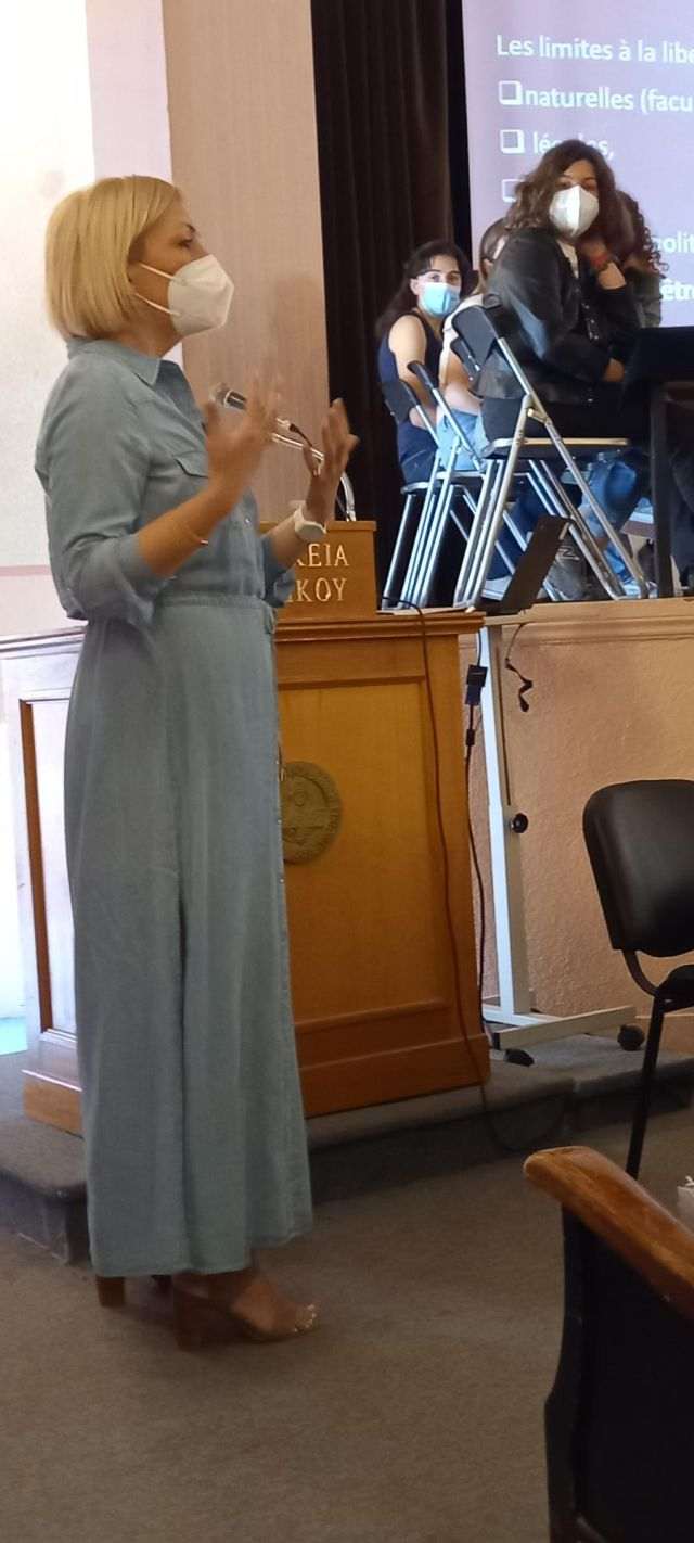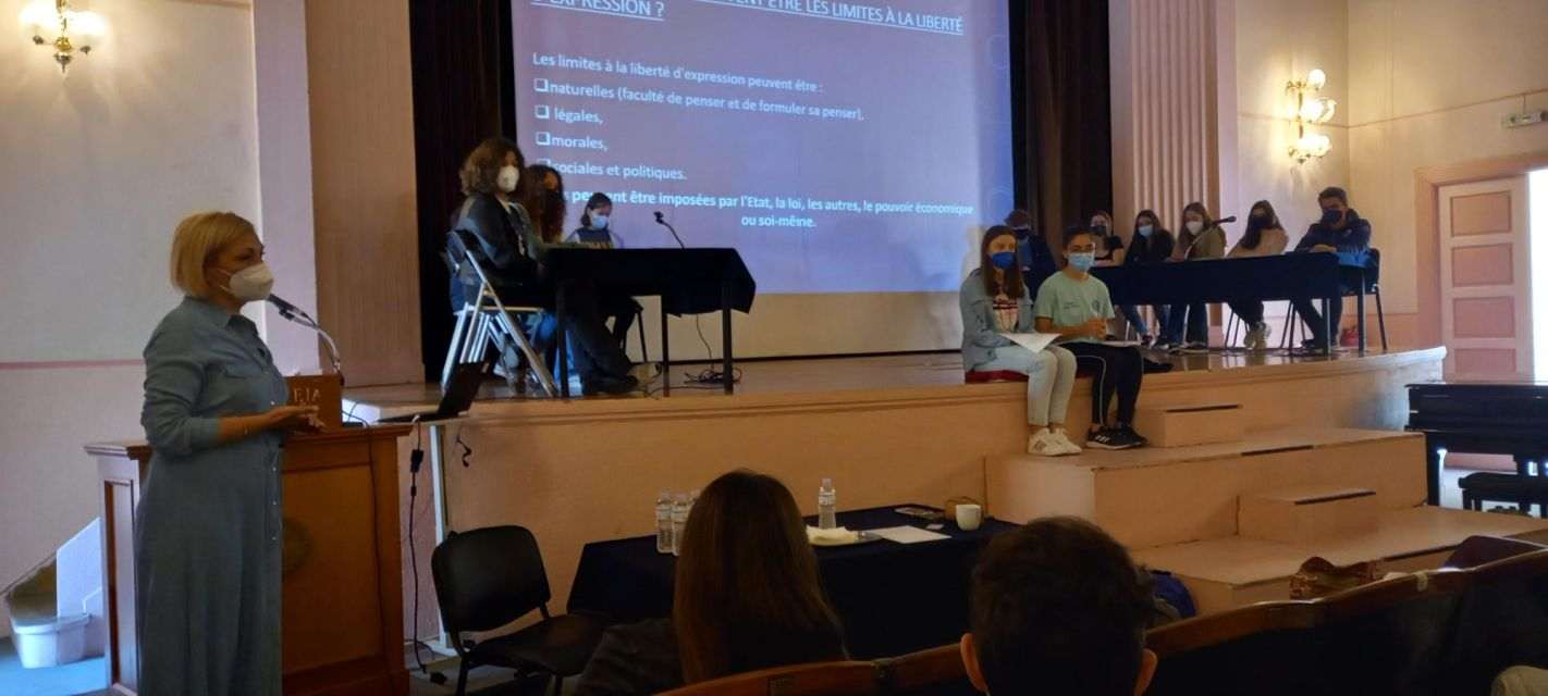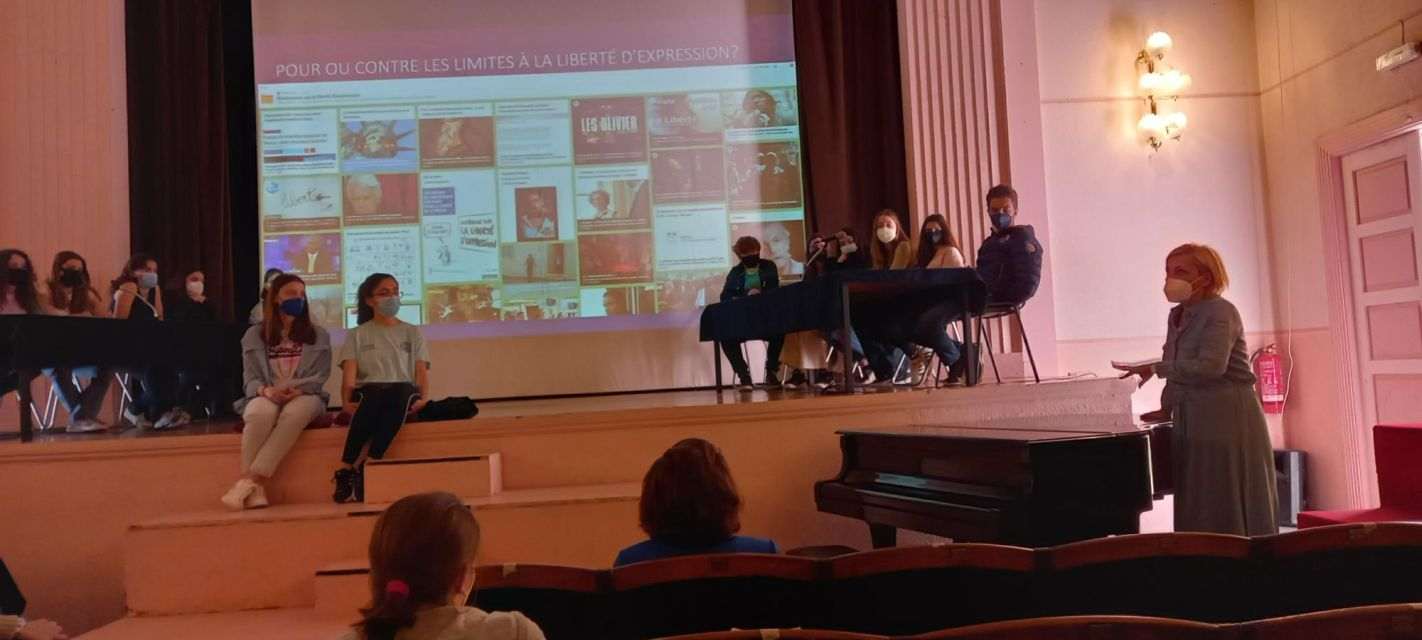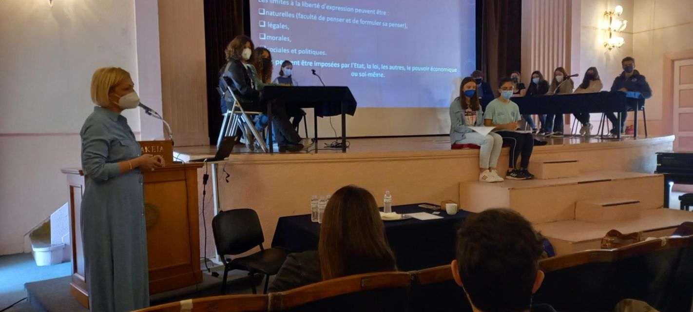 Οι μαθητές των προχωρημένων τμημάτων Γαλλικών τής Α΄ τάξης τού Β΄ Αρσακείου Λυκείου Ψυχικού, με καθηγήτριες τις κ. Β. Κοντού και Μ. Σερβετά, είχαν την ευκαιρία, την Παρασκευή 6 Μαΐου 2022, να παρακολουθήσουν επί δύο διδακτικές ώρες, στο Θέατρο των Σχολείων, μια σημαντική εκδήλωση: δεκατέσσερεις συμμαθητές τους, μοιρασμένοι σε δύο ομάδες, παρουσίασαν, στα Γαλλικά, επιχειρήματα υπέρ και κατά τής πλήρους ελευθερίας στην έκφραση και στον Τύπο και συνομίλησαν για συναφή θέματα με την έγκριτη δημοσιογράφο τής τηλεόρασης και τού ραδιοφώνου τού ΣΚΑÏ κ. Έλενα Παπαδημητρίου.