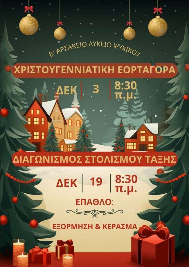 Αρσάκεια - Τοσίτσεια Σχολεία2025-03-28T11:44:01+02:0025 Νοεμβρίου, 2024|Κατηγορία: Β' Λύκειο Ψυχικού|Λέξεις κλειδιά: Χριστουγεννιάτικη Εορταγορά - Διαγωνισμός Στολισμού Τάξης|