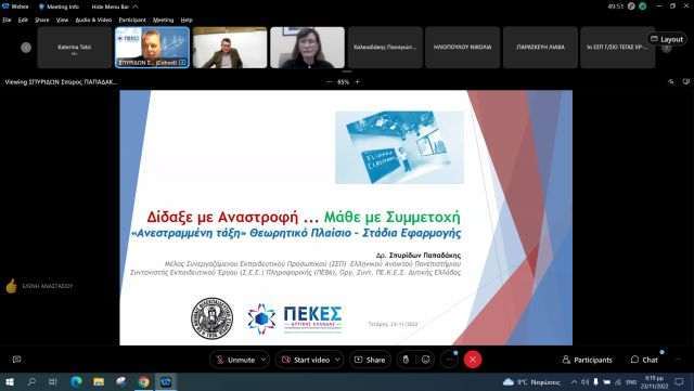 Στο πολύ ενδιαφέρον σεμινάριο παρουσιάστηκε το θεωρητικό πλαίσιο για το μοντέλο τής ανεστραμμένης τάξης, από τον δρα Σπυρίδωνα Παπαδάκη, Οργανωτικό Συντονιστή τού ΠΕΚΕΣ Δυτικής Ελλάδος και ΣΕΕ Πληροφορικής, καθώς και διδακτικές προτάσεις για όλα τα διδακτικά αντικείμενα.