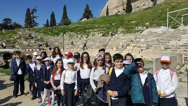 Στη συνέχεια, κατεβαίνοντας τον βράχο, έκαναν μια στάση στο θέατρο τού Διονύσου, το αρχαιότερο θέατρο τού κόσμου, όπου παίχτηκαν οι σπουδαιότερες τραγωδίες και κωμωδίες κατά τη διάρκεια των αρχαίων χρόνων. Γνώρισαν τα μέρη τού αρχαίου θεάτρου και μίλησαν για τους αγώνες θεάτρου που γίνονταν εκείνα τα χρόνια προς τιμήν τού Διονύσου.