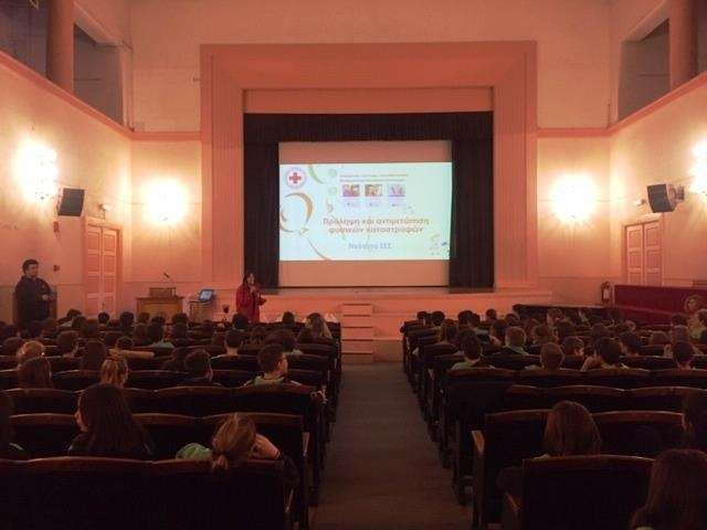Η διεθνολόγος κ. Λ. Κανάτα, εθελόντρια τού Ε.Ε.Σ., παρουσίασε τις συνθήκες κάτω από τις οποίες προκαλούνται διάφορες φυσικές καταστροφές, όπως πυρκαγιά, σεισμός και πλημμύρα, και πρότεινε, με βιωματικό τρόπο, στους μαθητές τρόπους αντιμετώπισης και προστασίας.