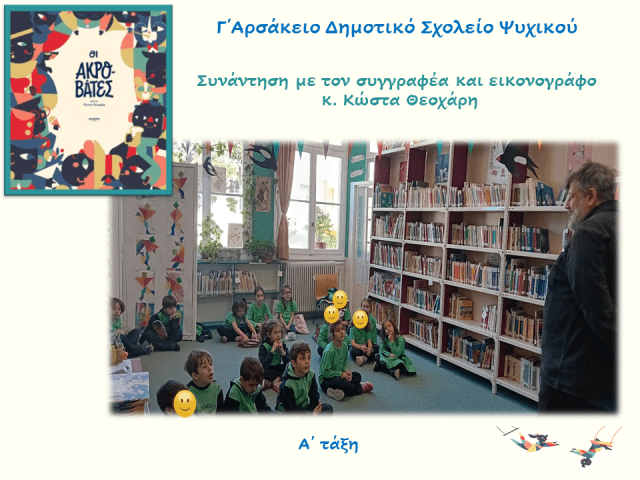 Την Παρασκευή 7 Μαρτίου 2025 οι μαθήτριες και οι μαθητές τής Α΄ τάξης τού Γ΄ Αρσακείου Δημοτικού Ψυχικού υποδέχτηκαν τον συγγραφέα και εικονογράφο τού βιβλίου«Οι ακροβάτες», κ. Κώστα Θεοχάρη. Η συνάντηση με τον συγγραφέα έλαβε χώρα στην Παιδική Βιβλιοθήκη τού Σχολείου.