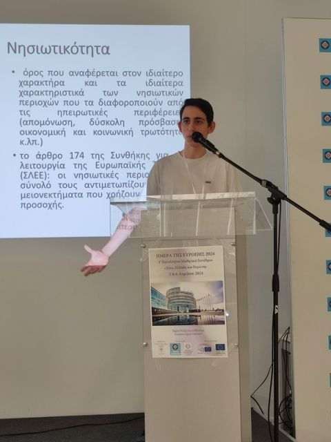 Οι μαθητές τής Β΄ τάξης τού Αρσακείου Γενικού Λυκείου Ψυχικού Τσιοχαντάρη Δήμητρα, Λέκκας Αναστάσιος και Στάϊκος Εμμανουήλ, υπό την καθοδήγηση τής Διευθύντριας κ. Δουζίνα Μαρίκας, παρουσίασαν εισήγηση με θέμα: «Οραματιζόμενοι μια έξυπνη οικολογική οικονομία για την Ελληνική νησιωτικότητα».