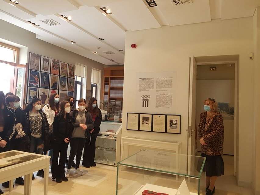 Η κ. Σπανού, υπεύθυνη τού μουσείου, και ο κ. Δ. Θεοδωρακάκος, μαραθωνοδρόμος και δρομέας μεγάλων αποστάσεων, ξενάγησαν, σε ομάδες, τους μαθητές στα εκθέματα τού μουσείου.