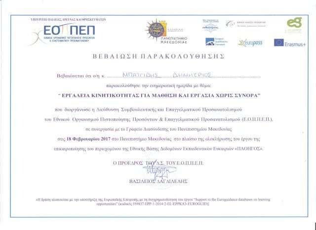 Ο κ. Δημήτριος Κ. Μπατγίδης, υπεύθυνος των Εργαστηρίων Φυσικής – Χημείας – Βιολογίας τού Αρσακείου Λυκείου Θεσασλονίκης παρακολούθησε την ενημερωτική ημερίδα«Εργαλεία κινητικότητας για μάθηση και εργασία χωρίς σύνορα».