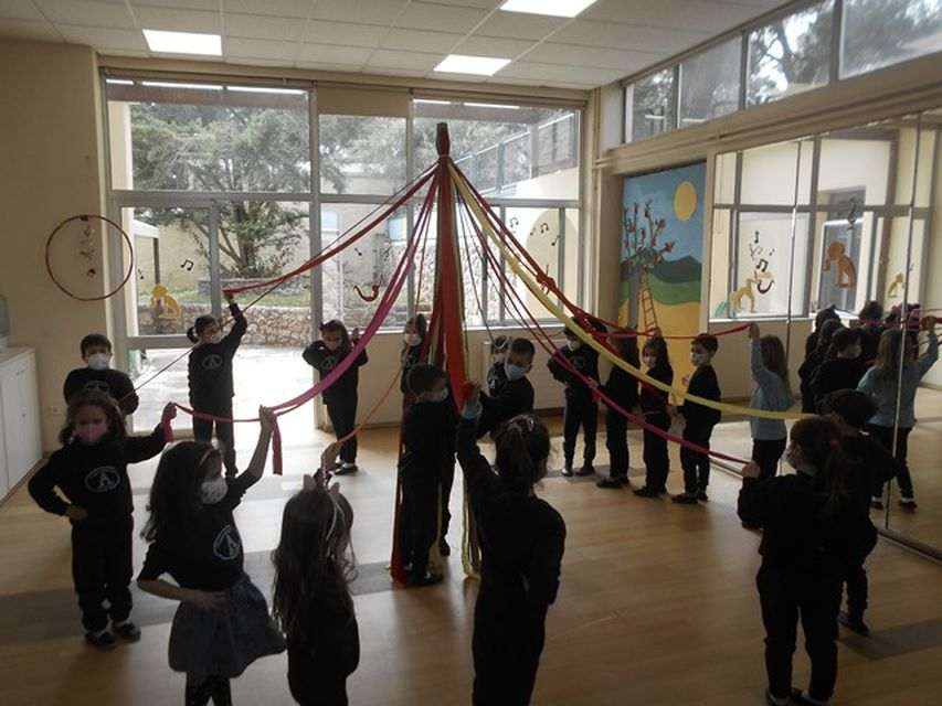 Στην εξειδικευμένη δραστηριότητα τής Ελληνικής Παράδοσης συζήτησαν με την υπεύθυνη νηπιαγωγό κ. Ντίνα Γκαραγκάνη για το παραδοσιακό γαϊτανάκι, και στη συνέχεια στην εξειδικευμένη δραστηριότητα τής Ρυθμικής και Κινητικής Αγωγής, με την καθοδήγηση τής υπεύθυνης κ. Σιμόνης Στραυροπούλου, χόρεψαν στον ρυθμό τού Καλαματιανού γύρω από το γαϊτανάκι με έκδηλο ενθουσιασμό και τις δύο νηπιαγωγούς τους να τα χειροκροτούν και να τα καμαρώνουν!